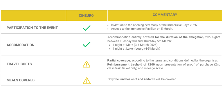 Bringing together a delegation of 10 professionals, this meeting is organised on the occasion of the Immersive Days 2026 professional meetings in Luxembourg (4-5 March 2026), in collaboration with the Film Fund Luxembourg. For three days (Tuesday 3 to Thursday 5 March 2026), the ten participants will receive dedicated support and a personalised programme exploring the local ecosystem in conjunction with specialised local partners.